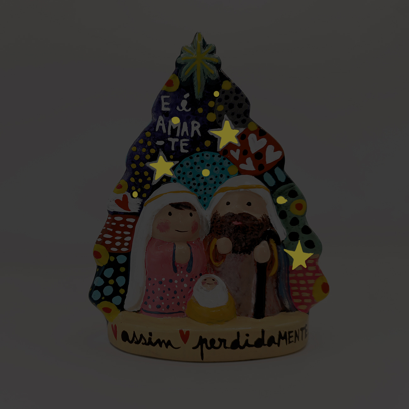 Presépio Perdidamente [ pintado à mão ] 58,50 € Desconto de %. IVA incluído. Partilhar Comprar Contactar 1 unidades em stock | SKU: pres_003 Presépio em cerâmica pintado à mão PEÇA ÚNICA E ASSINADA. Citação de Florbela Espanca. Iluminação LED interior. Pilhas incluídas. Medidas aproximadas 12,3 x 8,0 x 16,0 cm MADE IN PORTUGAL Tags presépioMariaJoséMenino Jesusnatalpintado à mãopeça únicafamíliaFlorbela espancaamar-te perdidamenteliteratura portuguesaamor Características