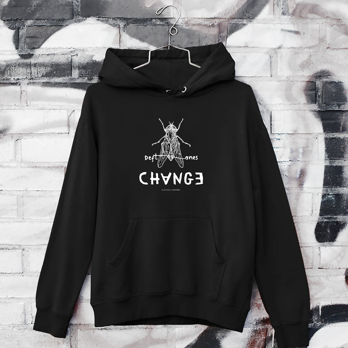 Sweatshirt preta com estampado branco de inseto e textos em parede grafitada