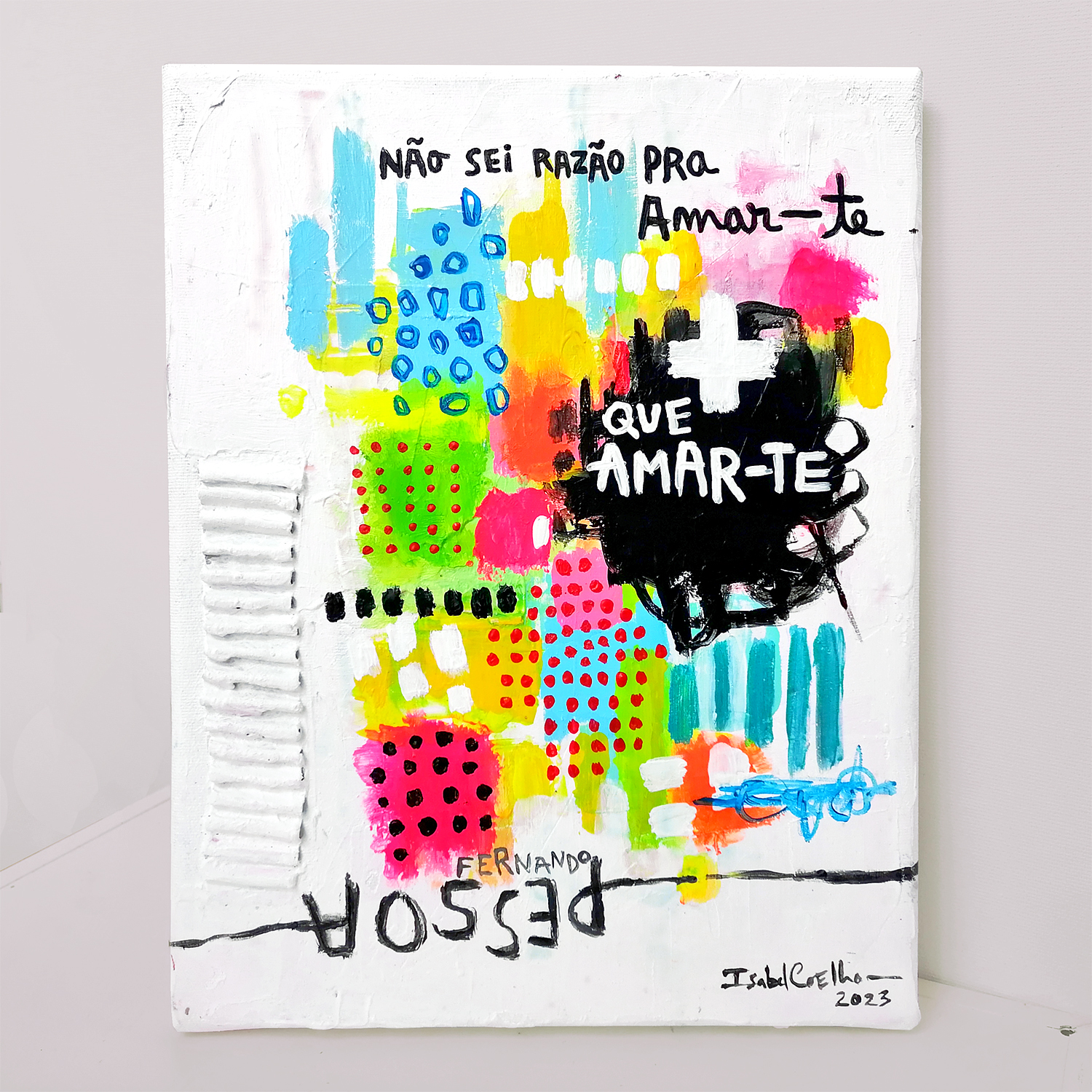 Tela original "+ que Amar-te" [ Fernando Pessoa ] 97,50 € Desconto de %. IVA incluído. Partilhar O produto encontra-se sem stock. Pintura a acrílico sobre tela. Formato 24 X 30 cm. Com citação de Fernando Pessoa Integra uma série de pinturas com a temática Amor Original assinado e datado Tags Fernando Pessoaliteratura portuguesaescritores portuguesesamortelapinturapintura abstrataacrílicooriginal