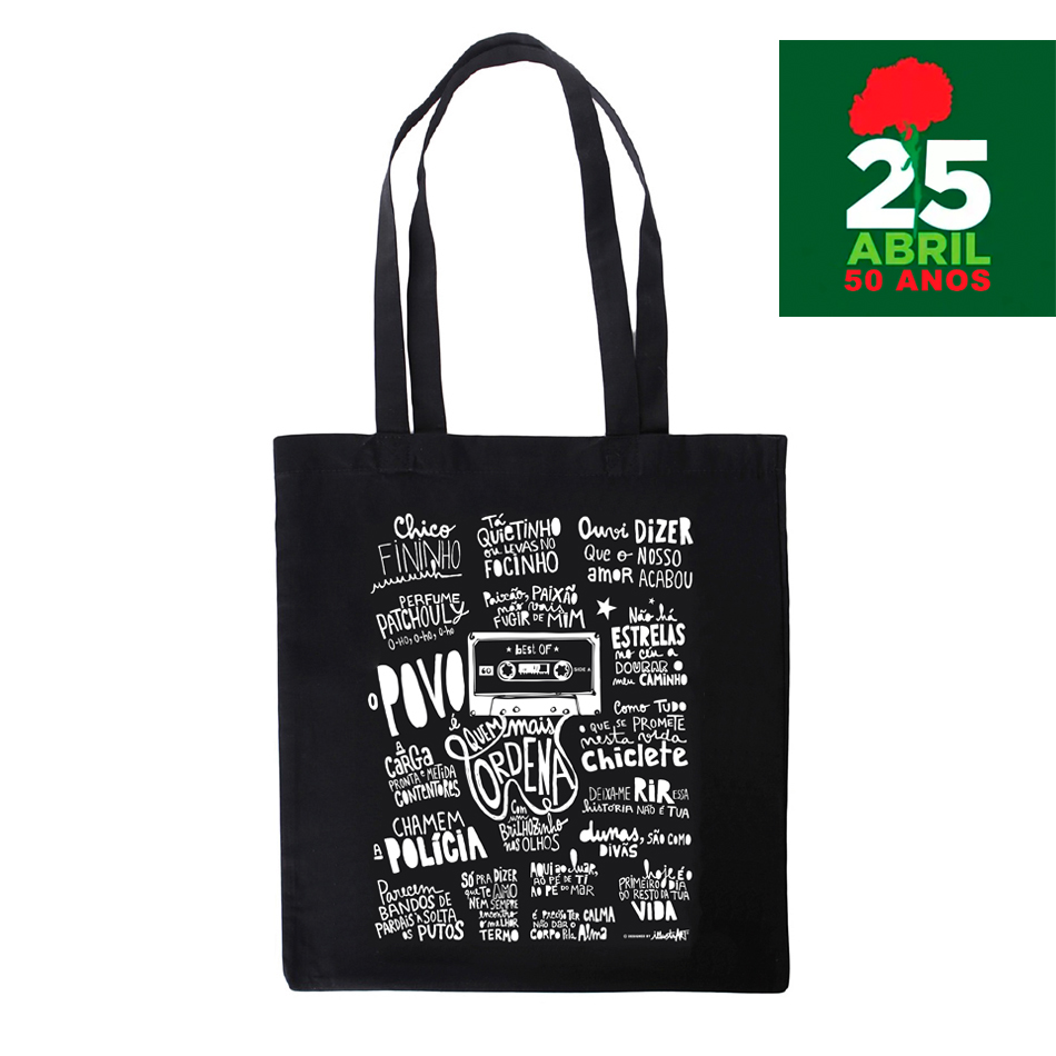 tote bag "o povo é quem mais ordena" [música portuguesa] 9,50 € Desconto de %. IVA incluído. Partilhar Comprar Contactar SKU: BAGMSPT001 Saco de algodão ● Design original e exclusivo da nossa marca. ● 100% ALGODÃO // COR PRETO // 140 G ● ALÇAS COMPRIDAS //APROX. 70 CM ● DIMENSÕES 38 X 42 CM ● IMPRESSÃO EM SERIGRAFIA ● MADE IN PORTUGAL Designed by IllustrART©. All rights reserved Tags totebagsacomúsicamúsica portuguesaZeca Afonso25 de Abril