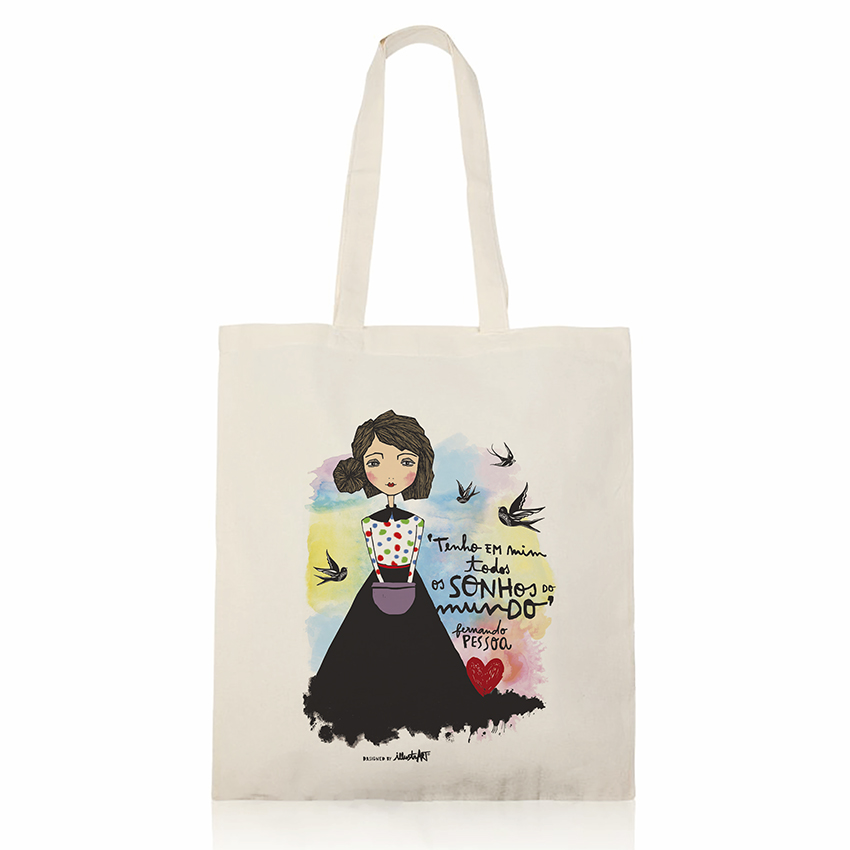 tote bag SONHOS [ Fernando Pessoa ] 11,50 € Desconto de %. IVA incluído. Partilhar Comprar Contactar SKU: tb0012 Saco 140 g/m². 100% algodão Impressão directa.Alças compridas - aproximadamente 70 cmDimensões: 38 x 42 cm Designed by Isabel Coelho© IllustrART®. All rights reserved. Made in Portugal. Tags totebagsacoFernando Pessoaandorinhasboneca Características