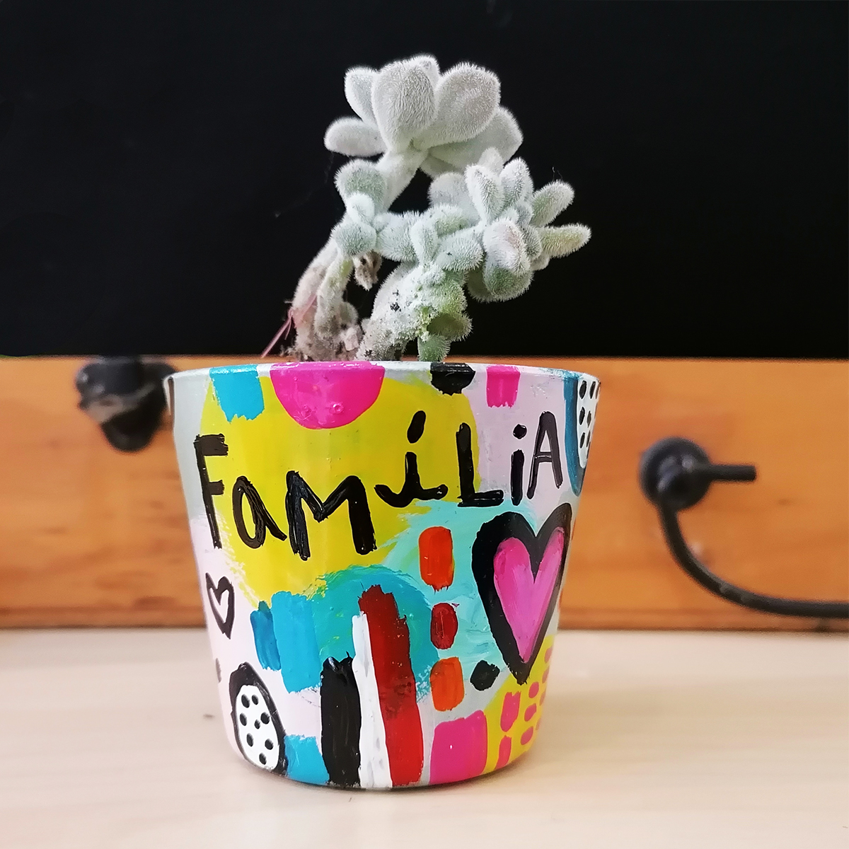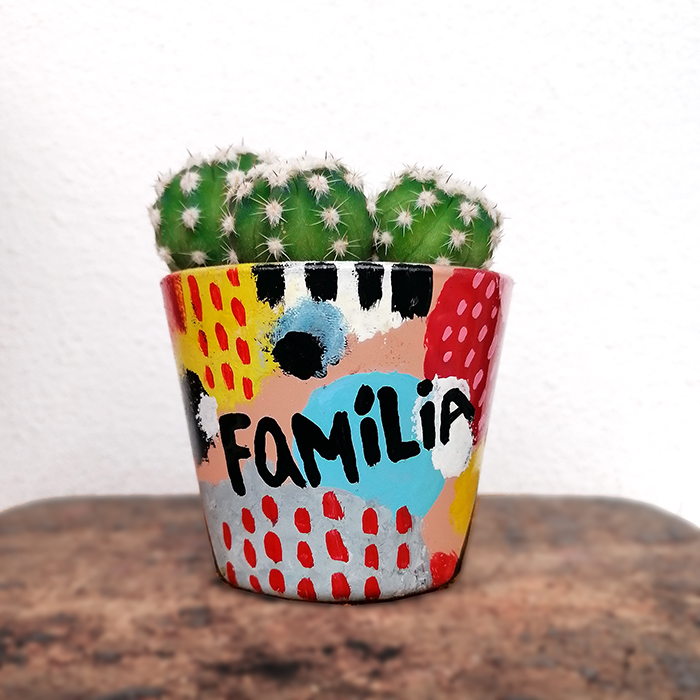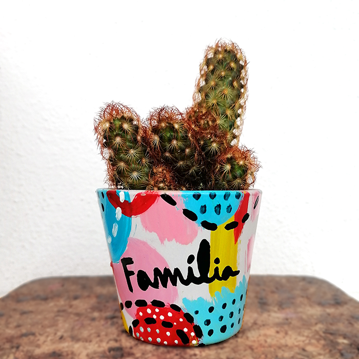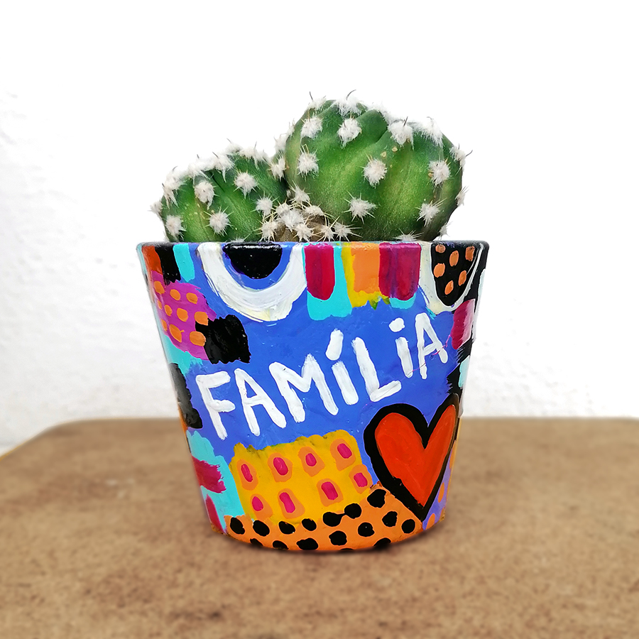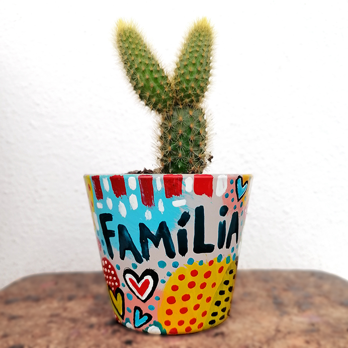 • Vaso pintado com cacto e a palavra FAMÍLIA